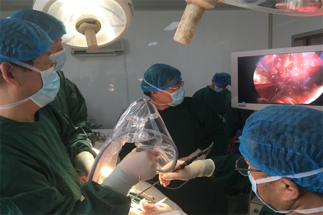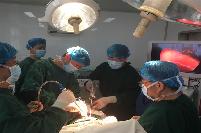 2018年12月8日由我院刘锦程院长主刀,科主任陈其亮、副主任李军孝及麻醉护理团队共同配合,历经4个小时成功完成了我院第一例小切口下电子胸腔镜微创结核性脓胸病灶清除及纤维板剥脱术,手术视野清楚,创伤出血少,术后恢复快,术后第一日即能下地活动。当日术中,外聘专家金峰和宋言峥教授指导操作要点及腔镜使用方法。