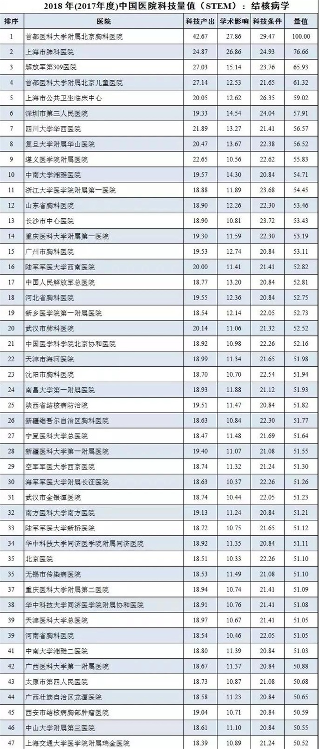 12月23日,由中国医学科学院主办、中国医学科学院医学信息研究所承办的“2018年(2017年度)中国医院科技量值发布会暨第六届中国医学科学发展论坛”在中国医学科学院礼堂举行。会上发布了中国医院科技量值(STEM)年度排名。今年的排名共对1662家三级医院进行科技量值评价,评价对象较往年增加了33家,涵盖29个学科领域,共有474家医院进入前100位,2018年(2017年度)中国医院科技量值(STEM)结核病专科榜单前100排名,在结核病学领域,陕西省结核病防治院位列全国第25名,在全省排名第一,实现了“三个零的”突破,建院60来以结核专科为主的治疗、预防、科研在全国榜上有名。
