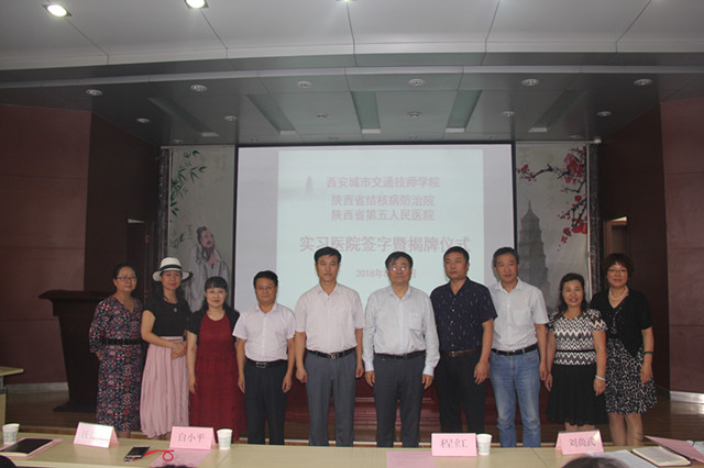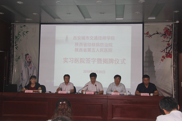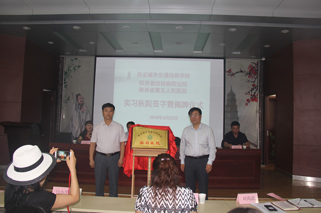 2018年6月20日上午,陕西省结核病防治院,陕西省第五人民医院与西安城市交通技师学院实习医院签约揭牌仪式在陕西省结核病防治院多功能学术厅举行,仪式由副院长仵倩红主持,西安城市交通技师学院周耀峰副院长等一行4人、陕西省结核病防治院院党政领导班子成员、全院中层干部、部分护士代表及西安城市交通技师学院实习护士近100人参加了活动。