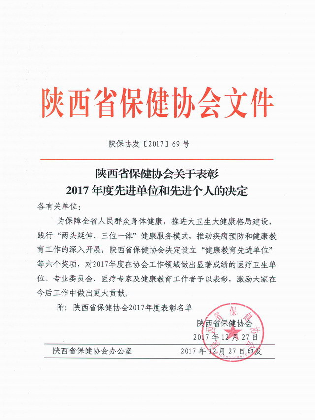 1月13日 ,陕西省保健协会2017-2018年会暨理事工作会议在陕西省人民政府机关综合楼隆重举行。陕西省保健协会名誉会长耿庆义、会长吕永杰、副会长王岐山等出席会议,会议由学会副会长兼秘书长王岚主持,我院刘锦程院长一行10人参加会议。 首先,吕永杰会长对陕西省保健协会2017年度工作进行了总结,并对未来工作做出了详细规划。接着,王岐山副会长宣读表彰文件及名单。随后,进行了现场颁奖。我院荣获2017年度公益活动先进单位,我院积极参加公益巡讲活动,医院王亚梅、石海萍、王景民、徐红艳、刘莉六位专家荣获“公益巡讲专家”称号。陕西省卫计委副主任陈昭做了总结讲话,对学会本年度所取得的可喜成绩表示充分地肯定和祝贺,并对以后的工作提出了希望和要求。 今后,我院将继续在陕西省保健协会指导下进一步开展和深化结核病防治的相关工作,为广大基层单位提供坚实的专业后盾,为陕西省的结核病防治工作做出更大的贡献。