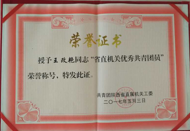 我院团委荣获“共青团陕西省直机关工委五四红旗团委”、王改艳同志获得“省直机关优秀共青团员”称号