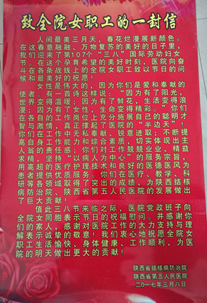 女性是伟大的,因为你们是爱和奉献的使者。有一首诗这样说:“因为有了阳光,世界变得温暖;因为有了鲜花,生活变得浪漫;因为有了女性,生命变得精彩。” 你们在各自的工作岗位上充分施展自己的聪明才智与激情,真正撑起了医院的“半边天”!你们在工作中无私奉献、锐意进取;不断提高自身工作能力和综合素质,切实体现出主人翁的责任感;你们对工作兢兢业业、精益求精,坚持“以病人为中心”的服务宗旨,用高超的医疗护理技术和良好的医德医风为患者提供优质的服务。你们在医疗、教学、科研等各领域取得了突出的成绩,为陕西省结核病防治院、陕西省第五人民医院的发展做出了巨大贡献!