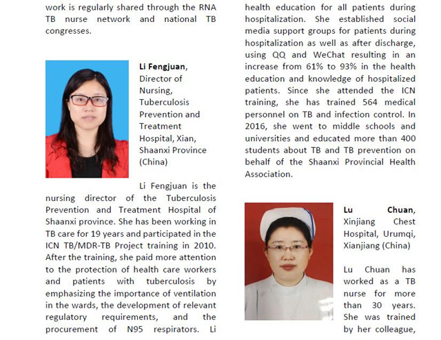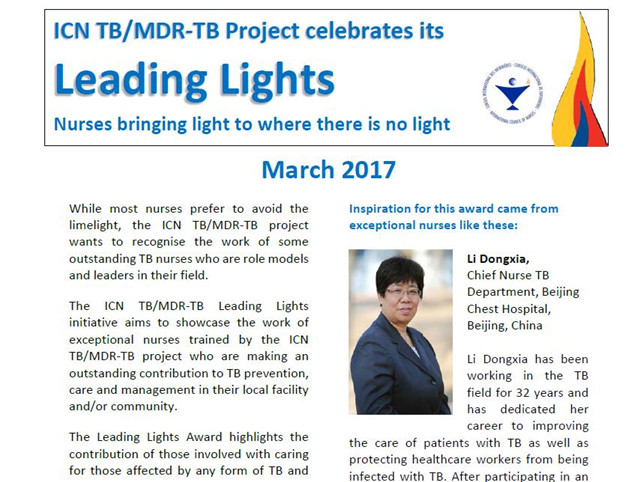 为表彰杰出护理工作者在其领域做出的突出贡献及其示范作用,“国际护士会结核病/耐多药结核病项目”在3.24—世界防治结核病日,宣布了获得2017年“领导者之光(杰出结核护士)”荣誉称号的护士,我院护理部主任李凤娟榜上有名,本次中国共有3名护士获此殊荣。