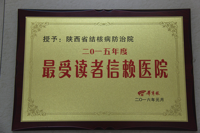 2016年1月,《华商报》推出了“牵手·打造健康陕西”2015年陕西医疗行业总评榜活动,经过读者推荐、网络投票、华商报评审等众多环节,陕西省结核病防治院与23家医院被评为“2015年度最受读者信赖医院”。这是华商报百万读者和三秦百姓对我院的充分认可与肯定。