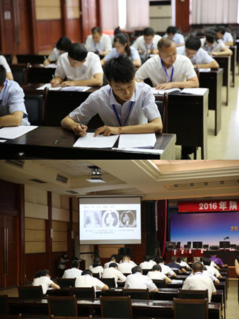 上午9:00~12:00,进行了包括基础理论、阅片、病例分析在内的笔试环节,11支队伍共55名选手现场作答,选手们认真细心,现场秩序井然,笔试环节结束后试卷当场装订密封,由竞赛组委会邀请专家组利用中午时间阅卷统分。笔试环节成绩决定了选手的个人奖项,其中成绩最为优秀并且符合组队规则的五名选手将代表陕西出征九月份举办的全国结核病临床技能竞赛。每队五名选手的笔试成绩总分将作为下午团体竞赛环节基础分计入团体总成绩。