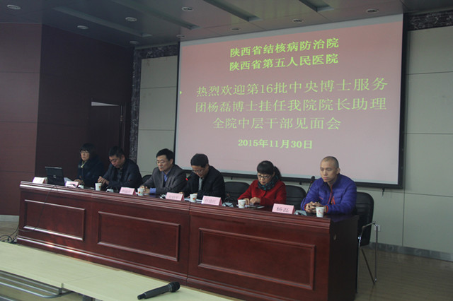 杨磊博士11月27日星期五到陕,上午省委组织部召开了欢迎见面座谈会,下午医院派专人接到医院,立即召开了院领导班子成员、职能部门科长与杨博士简短见面会,将医院简况向杨博士作了介绍。11月30日星期一上午召开全体班子成员和中层干部护士长与杨博士见面会,会议由甘昭平书记主持。首先介绍了杨磊博士的基本情况,各位中层干部护士长也一一做了自我介绍。杨博士做表态发言:感谢组织对他的培养和信任,有幸能来我院挂职锻炼工作,感谢医院对他的办公及住宿等方面的妥善安排;指出我院和北京市结核病胸部肿瘤研究所(北京市胸科医院)是友好技术协作单位,一定会将协作机制建立起来,增进两家医院友谊。
