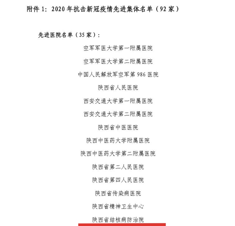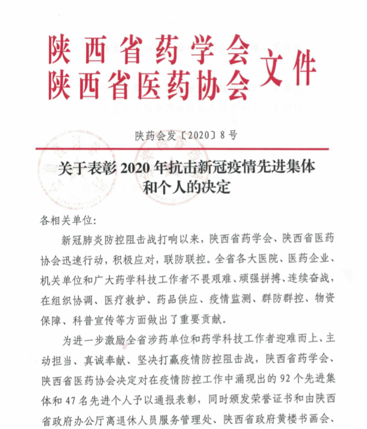 近日,为进一步激励全省涉药单位和药学科技工作者迎难而上、主动担当、真诚奉献的抗疫精神,陕西省药学会、陕西省医药学会联合表彰陕西省92个先进集体,我院名列其中。自从新冠肺炎疫情发生以来,我院迅速行动,联防联控,至今为止无一例漏诊、误诊,有效保障了人民群众的生命安全,为陕西的疫情防控工作做出了自己的贡献,疫情还未彻底结束,我院也将一如既往,做好日常诊疗工作的同时,确保疫情防控不放松,为打赢疫情防控阻击战站好最后一班岗。