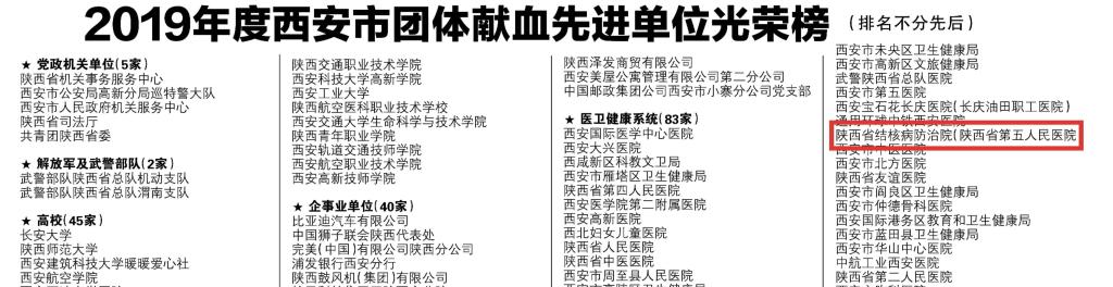 无偿献血是为社会奉献爱心、救死扶伤的崇高行为。近日,西安市中心血站(陕西省血液中心)发布2019年度西安市团体献血先进单位光荣榜,感谢倡导组织无偿献血的单位和团队,我院名列其中。