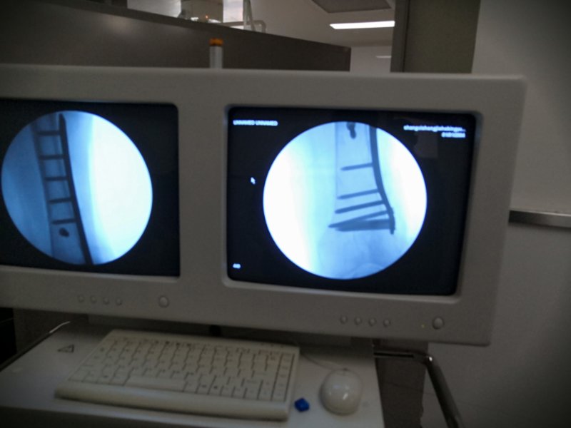 科室刘军政主任了解到这些情况后高度重视,积极进行术前准备,完善相关检查,针对患者病情,身体条件及一般情况充分多次评估后,亲自主刀,为患者施行股骨下段切开复位钢板内固定术,术中仔细解剖,严密止血,充分清理骨折断端坏死组织,选用合适长度锁定钢板固定,C型臂透视证实对位,对线良好,手术历时1小时20分钟顺利结束。术后为其制定了严密的治疗护理计划,包括营养支持,预防感染,肢体锻炼等一系列措施,帮助其快速恢复。