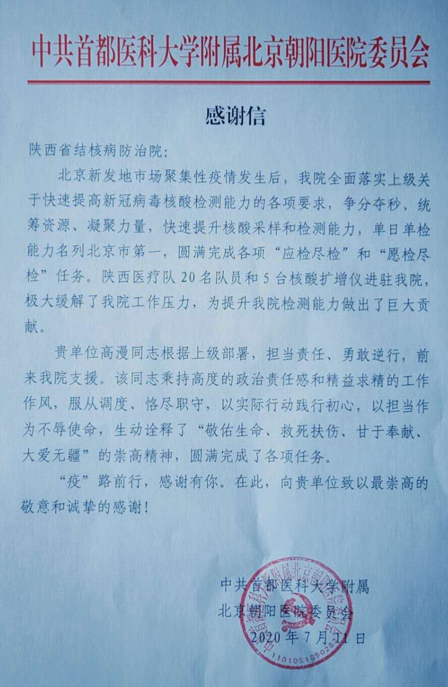 北京新发地市场聚集性疫情发生后,陕西省卫健委迅速反应,抽调18家医疗卫生机构共20名检验专业人员快速集结,组建成陕西省支援北京核酸检测医疗队,我院第一时间响应,并迅速安排资深检验师高漫前往北京执行任务。信中指出:高漫秉承高度的政治责任感和精益求精的工作作风,服从调度,恪尽职守,圆满完成了各项任务。"疫"路前行,感谢有你,在此,向贵单位致以崇高的敬意和诚挚的感谢。