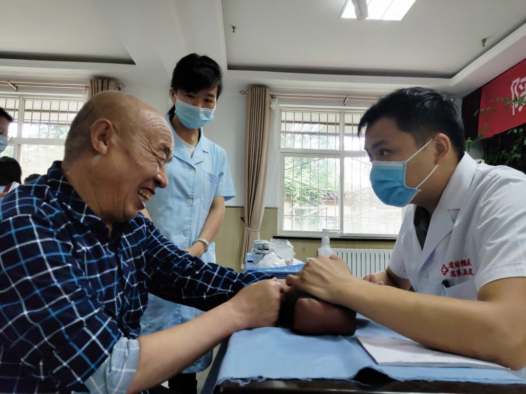 王莽区域养老院收住的多为无儿无女且伴有不同程度智力障碍的五保老人,是政府脱贫攻坚的重点对象。看到医护人员到来,老人们显得格外开心,而医护人员则耐心仔细地询问、了解每一个人的身体状况,一字一句,不紧不慢,为老人建立健康档案,同时望闻问切,辨证贴敷,现场制作了失眠贴,送给在场的每一个老人,让大家乐开了花。