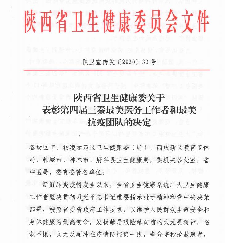 8月4日,陕西省卫生健康委下发关于表彰第四届三秦最美医务工作者和最美抗疫团队的决定,授予全省300名同志“第四届三秦最美医务工作者”荣誉称号,我院刘红艳主任医师、杨薇主管护师名列其中。