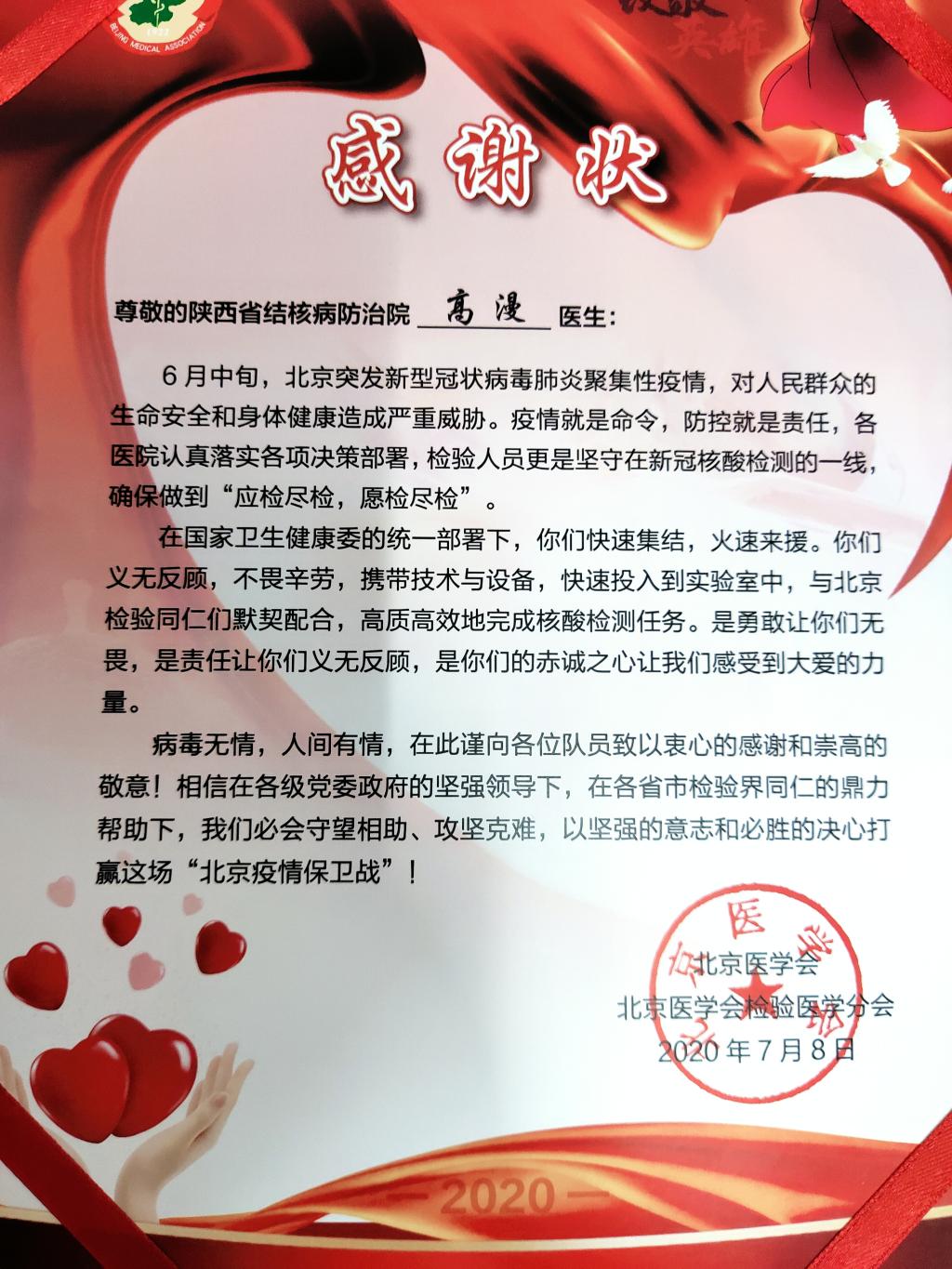 近日,我院收到北京医学会检验医学分会的感谢信,信中对我院积极派遣专业检验人员支援北京核酸检测工作的义举表达了诚挚的感谢和崇高的敬意。