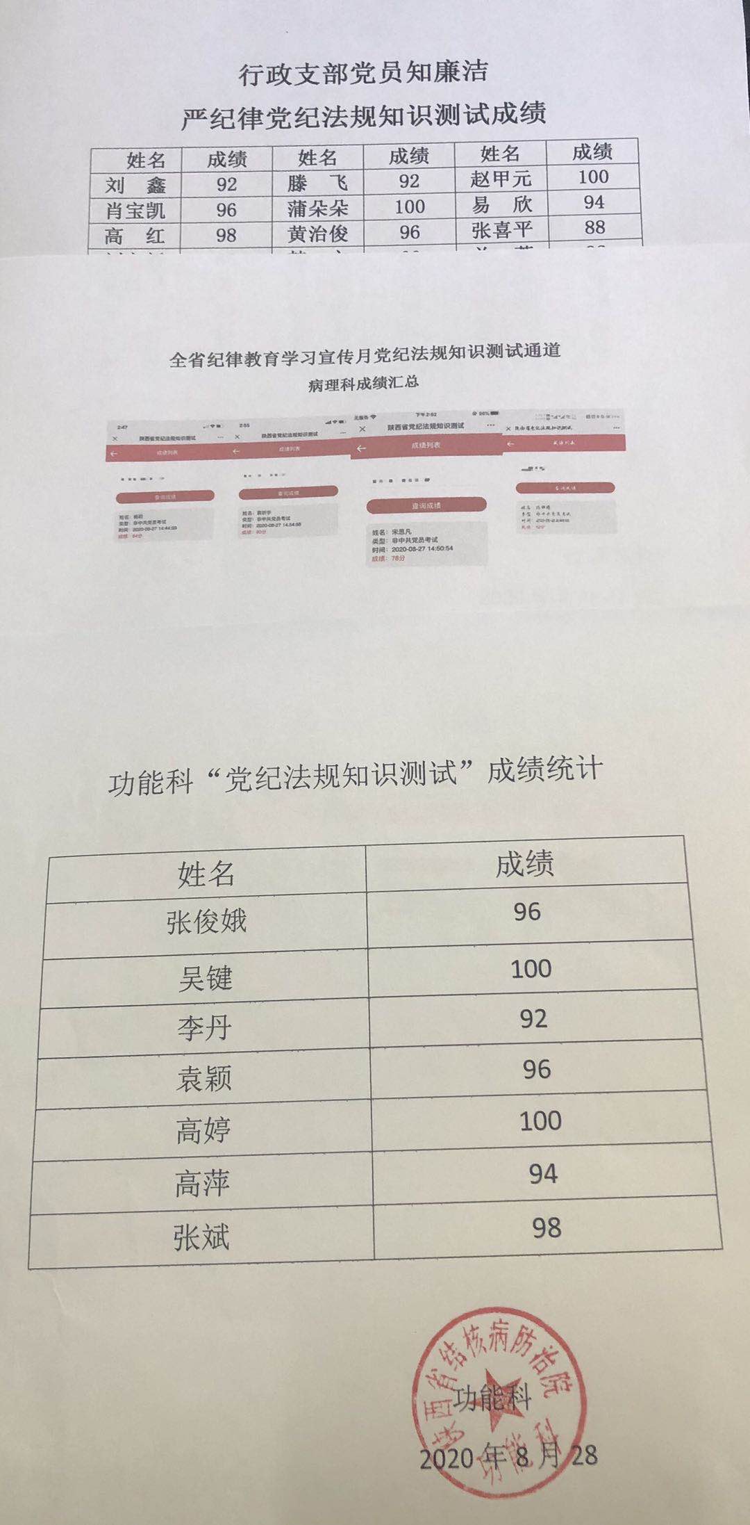 为不断加强我院纪律教育,强化纪律执行,助力构建一体推进不敢腐、不能腐、不想腐体制机制,扎实做好我院纪律教育学习活动,推动以案促改工作向纵深开展,我院于8月份开展了“知廉洁、严纪律”党纪法规知识测试,达到了全员参与,其中党员180多名,公职人员420多名,合格率达到百分之百,优秀人员占比百分之八十以上。