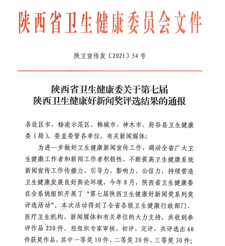 陕西卫生健康好新闻奖系列奖评选是由陕西省卫健委在全系统组织并开展的一项重要评选活动,旨在不断提高卫生健康系统新闻宣传工作传播力、引导力、影响力、公信力,持续营造卫生发展良好舆论环境,今年8月,“第七届陕西卫生健康好新闻奖”评选活动开始面向全省征集优秀新闻作品,经组织专家审核、初评、定评,最终评选出一、二、三等奖各10件、20件、30件。我院报送的网络新媒体消息《病房里的抗美援朝故事会》选题独特、主题突出,在220件参评作品中脱颖而出,与空军军医大学西京医院、西安交大一附院、陕西广电融媒体集团、西安市卫健委、汉中市卫健委等单位同时获得二等奖。