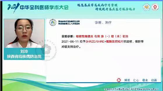 本次大会主题为“学习贯彻《基层医疗卫生机构常见疾病诊疗指南》”,因新冠疫情影响,采取“线上+线下”相结合的形式,组织邀请高质量的专家队伍,有针对性地对呼吸、心血管、消化、内分泌、神经、传染等系统常见疾病指南进行解读,提升基层/全科医师的理论与实践的综合水平,是一场极具特色的医学盛宴。同时为进一步贯彻诊疗指南在基层临床实践中的应用,大会特别设立“学以致用”诊疗指南基层实践病例大赛,在全国经过初审及4场线上预赛,最终选出来自14个省、直辖市的46名选手进入总决赛,病例涉及呼吸、消化、心血管、内分泌等多个系统的常见疾病。此次,刘玲病例选题“此水非彼水”经过大会初审及预赛选拔进入决赛,获得优胜奖。学习指南,落实指南,刻不容缓。希望我院全体医师持续深化学习、践行结核病治疗指南,促进结核病的规范诊疗,为广大患者创造更多健康福祉。