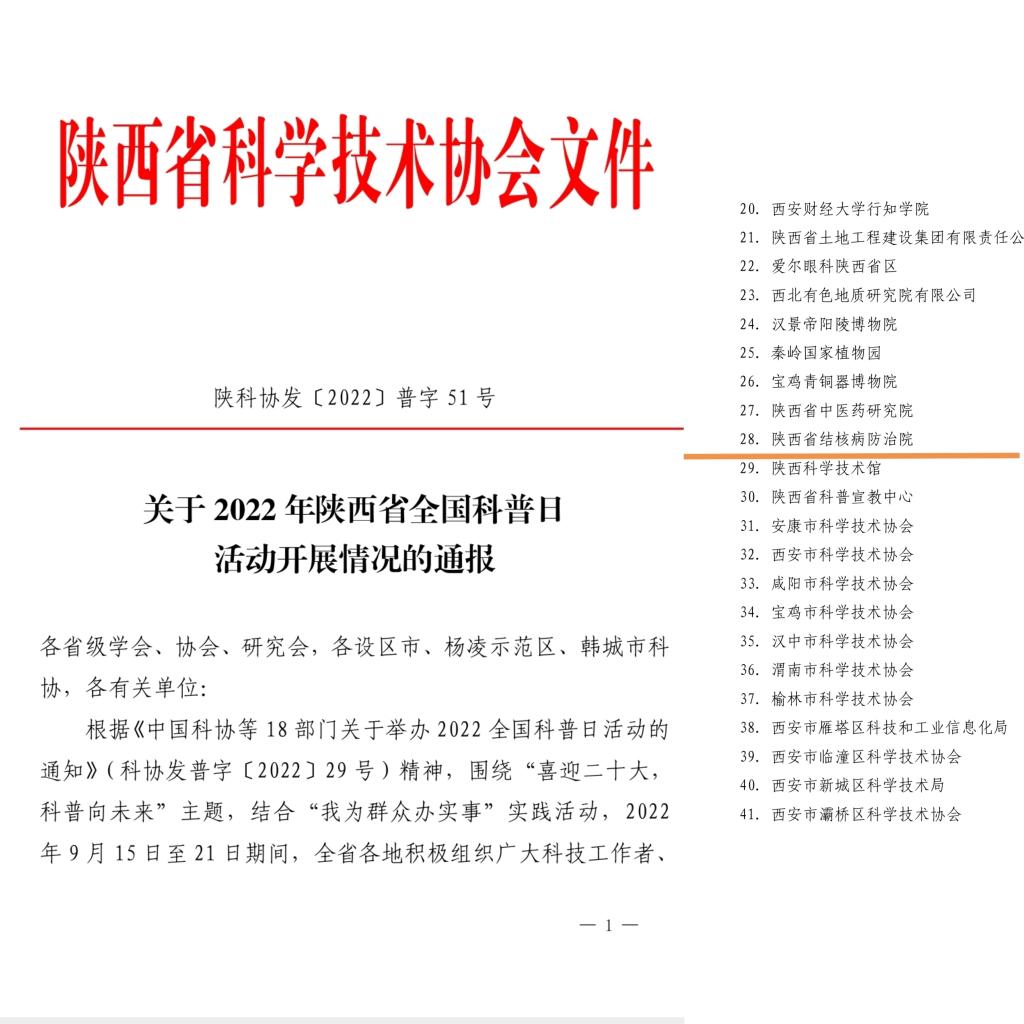 近日,陕西省科学技术协会对2022年陕西省全国科普日活动开展的情况进行了通报,我院获评优秀组织单位。