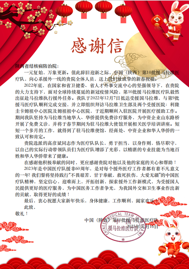近日,我院收到中国(陕西)第40批援马拉维医疗队的一封感谢信。信中对我院对援外工作的大力支持及我院援外人员高彦斌副院长的积极奉献表示衷心感谢。