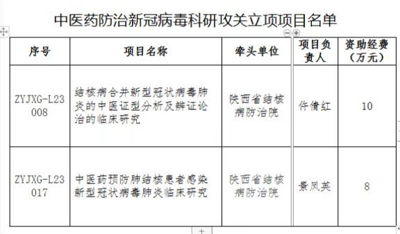 2月9日,陕西省中医药管理局发布了《关于确定中医药防治新冠病毒科研攻关项目的通知》,公布了获批立项项目及资助经费结果。我院仵倩红副院长申报的“结核病合并新型冠状病毒肺炎的中医证型分析及辨证论治的临床研究”和景凤英主任申报的“中医药预防肺结核患者感染新型冠状病毒肺炎临床研究”两个项目获批立项,获批资助经费共计18万元。