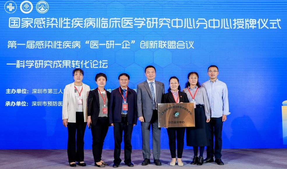 2023年3月17日至19日,国家感染性疾病临床医学研究中心分中心授牌仪式、第一届中国感染性疾病创新联盟会议及科学研究成果转化论坛在深圳举办,我院甘昭平书记、仵倩红副院长一行6人应邀出席,我院被授予“国家感染性疾病临床医学研究中心陕西分中心”荣誉奖牌。