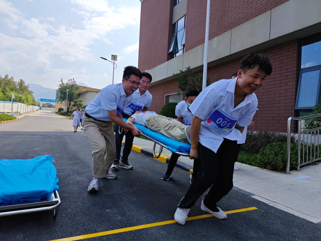 本次比赛分为急救知识、CPR+AED、伤员转运、海姆立克急救、止血包扎五个项目,每个项目由专人对标考核,比赛过程中,各组队员紧密配合,规范操作,专家现场指导、点评,评委专员现场打分。