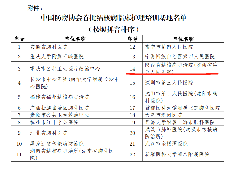 近日,中国防痨协会发布全国首批22家结核病临床护理培训基地医疗机构名单,我院成功入选,这是对我院结核病护理工作的充分肯定,必将进一步促进医院护理专科建设和专业人才培养方面整体能力的提升。