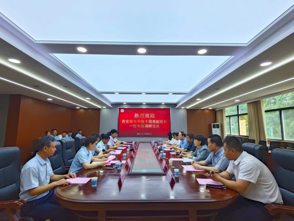 5月23日上午,西安培华学院副校长、医学院校长于国亮教授一行8人到我院调研、座谈,重点探讨医学人才的培养共育及院校共建共享共融等方面的新思路、新措施。座谈会由张虹副院长主持,甘昭平书记致欢迎辞,魏海龙院长、于国亮副校长分别讲话。院领导班子成员及相关行政职能部门及临床科室负责人参会。