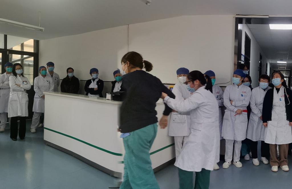 门诊环境中患者流动性大,年老体弱的患者极易发生跌倒损伤。门诊演练现场,一位老年女性患者行走时因地面湿滑摔倒在地,导医护士立即就地评估伤情并将患者移至安全区域,通知医生查体后,协助患者进行X线检查,向患者告知检查结果并进行预防跌倒相关知识宣教。演练进一步提高了护理人员识别跌倒高风险人群和规范处置的能力。