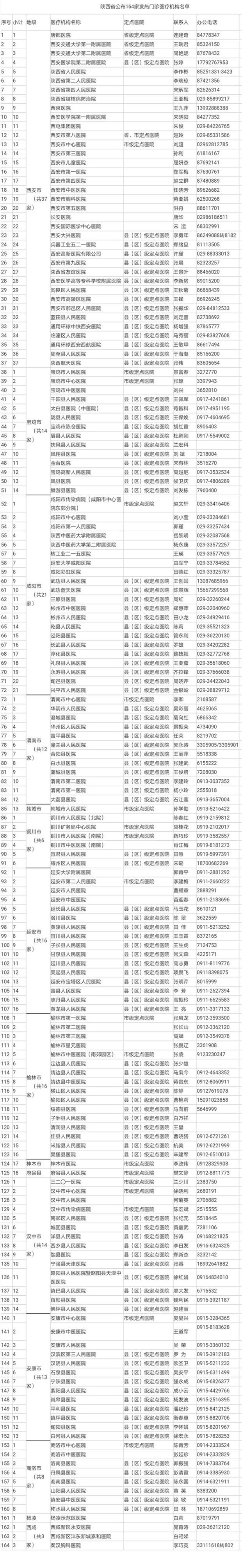 陕西省公布164家发热门诊医疗机构名单