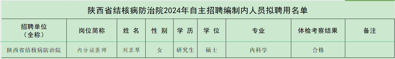 根据陕西省结核病防治院2024年卫生专业技术岗位人才招聘(第二批)工作安排,经资格审查、笔试、面试、体检及考察等程序,确定刘亚琴(详见附件)为陕西省结核病防治院拟聘用人员,现予以公示。如有异议,请向陕西省结核病防治院人事科反映。