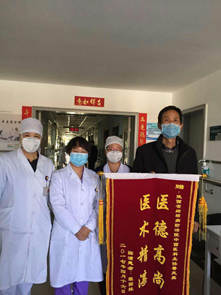 患者为男性,55岁,一年前一直进行抗结核治疗,反复出现肝损伤,自行停药,今年病情加重,于2月17日以“继发性肺结核”入我科。因结核病的反复复发,使得患者对于治疗失去信心,精神一度烦躁不安并对医护治疗产生强烈抵触情绪。面对患者的现有情况,景主任给予高度重视,立即组织科室大夫和护士长研究治疗和护理方案。最终决定给予患者中药调理和西药共同抗结核治疗并且加强患者的心理调护。经过为期2个月中西医结合治疗和精心护理,患者病情好转,重拾生活信心,能很好的配合治疗,并且在闲暇之余常找我们医护人员聊天,成为了我们的好朋友,无话不谈。完全打消了以前对医护人员的抵触情绪。在我们公休座谈会上还被评为模范患者。于4月17日出院,出院时专程定制了这面锦旗送到科室表达他的感谢之情。