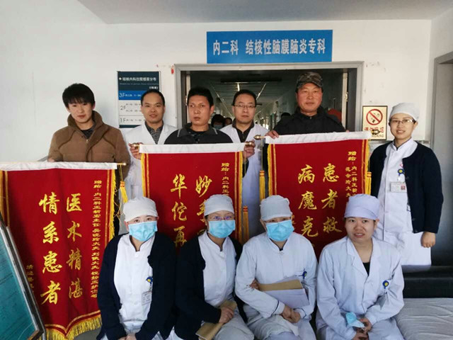 2016年1月25日,5名成功治愈的结核病患者携家属不约而同的来到了陕西省结核病防治院结核内二科、结核性脑膜炎治疗中心,他们冒着长安区太乙宫街道百年不遇的大雪和严寒,手捧着一面面鲜红的锦旗来到医护人员中间,他们分别是被王新宏主任医治好的李先生;被万月强副主任医治好的赵先生;被吴晓玲大夫医治好的白先生;被梁媛大夫医治好的黄先生;被范会玲大夫医治好的叶老先生。让我们在这医患关系复杂的当下,在这严冬里收获了一份温暖。