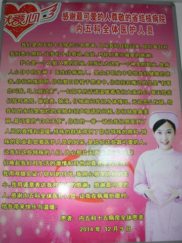 在这难忘的瞬间她们及家属说到:“特殊的群体得到了你们特殊的照顾,特殊的职业彰显着医护人员的风采,是你们这些最可爱的人,让我们这些特殊人的内心那片天更蓝、更美。是你们唤起我们对生活的激情和对世间真、善、美的诠释。”面对患者感激的话语,内五科的医护人员想说的是,亲爱的患者,一身疲惫、长夜的不眠都不算什么,有什么要求您就说,有什么不舒服就告诉我们,谁叫我们是这特殊的职业呢?我们唯有从心做起,真诚相待。这就是我们的工作。面对你们,我们只有一个心愿:盼你们早日康复,享受生活的美好!