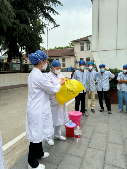 对医疗废物的收集及包扎方法,马曼曼老师讲解了收集医废时手卫生如何做,送往医废站的垃圾袋要求按鹅颈式捆绑双层包装,现场拿来医废垃圾袋进行了示范操着,并讲解了垃圾袋标签和医废交接单的规范填写内容挤注意事项。