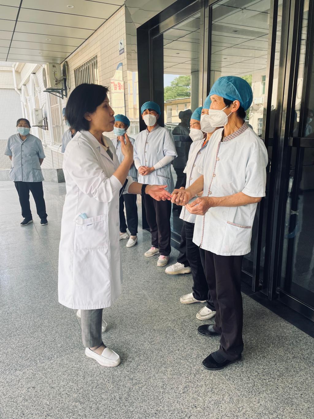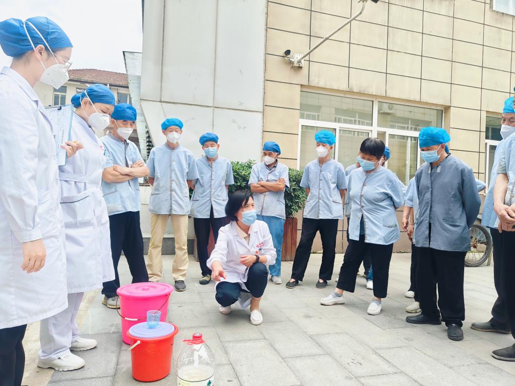 本次培训主要围绕保洁工作存在的突出问题,在培训方式上采用通俗易懂的授课方式,抓重点,用接地气的现场演示与互动进行培训,在培训内容上,主要围绕口罩佩戴,着装要求、手卫生、消毒液的配制、医废的收集和包扎运送、针刺伤后的现场处理等进行了培训。