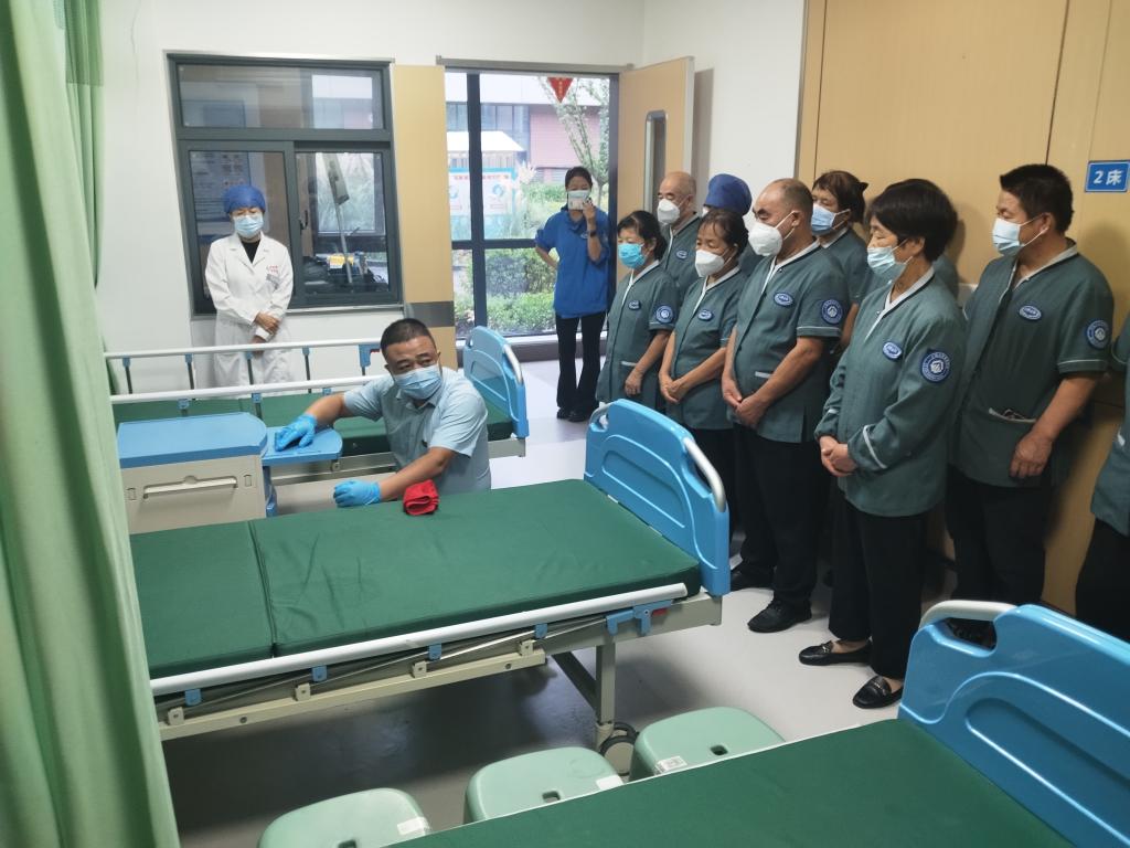 为持续提升我院环卫工作质量,营造安全舒适的病房环境,9月4号下午,环卫办组织保洁人员进行床单元终末消毒培训,培训由保洁经理吴少龙主持,培训地点设在综合内科病房。