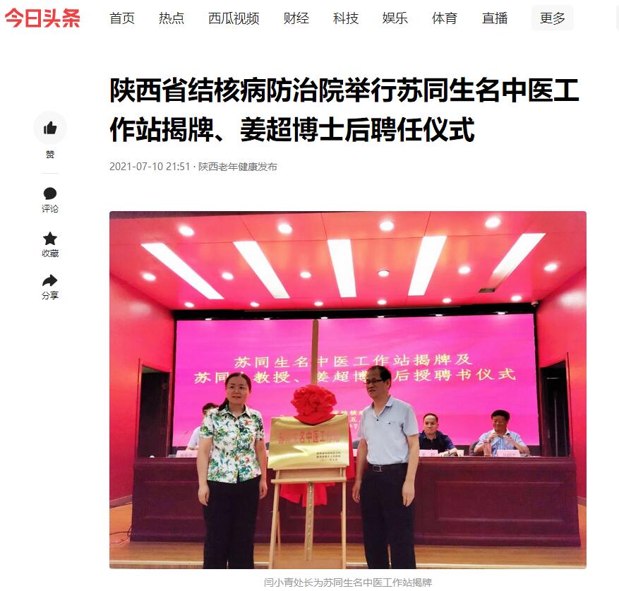 7月8日下午,苏同生名中医工作站揭牌及苏同生、姜超博士后聘任仪式在陕西省结核病防治院隆重举行。仪式由甘昭平书记主持,魏海龙院长宣布医院聘任决定。陕西省中医药管理局医政医管与教育处处长闫小青到会指导,院领导班子、机关行政科室、科主任、护长近百余人共同见证了这个载入医院发展史册的日子!