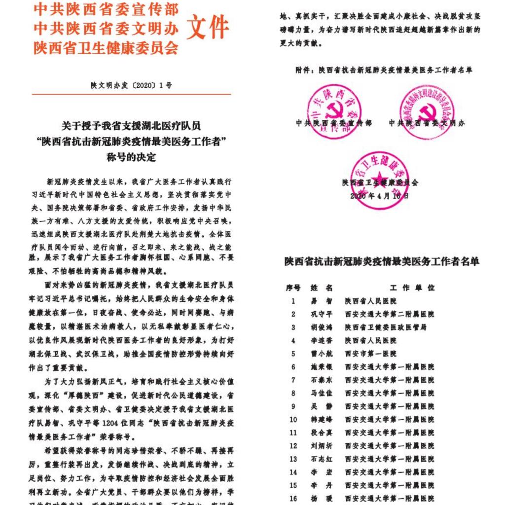 现根据中共陕西省委宣传部《关于授予我省支援湖北医疗队员“陕西省抗击新冠肺炎疫情最美医务工作者”称号的决定》(陕文明办发〔2020〕1号),我院10名援鄂医疗队员再次荣获“陕西省抗击新冠肺炎疫情最美医务工作者”称号。