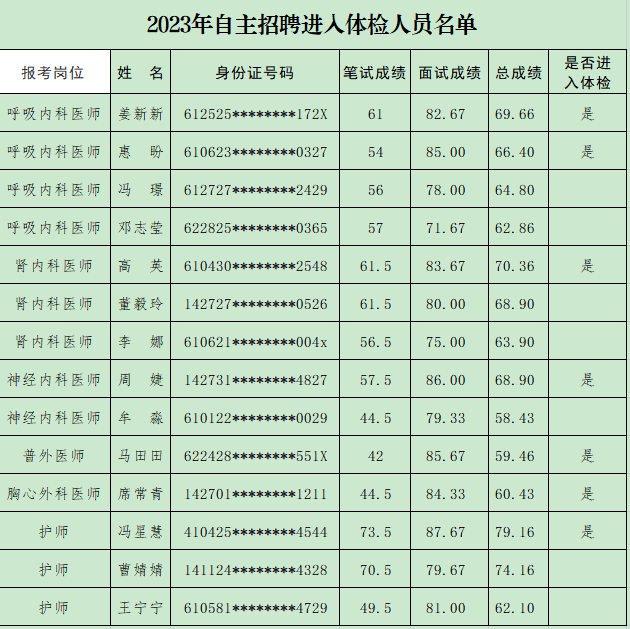 陕西省结核病防治院2023年自主招聘进入体检人员名单公示