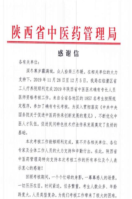 12月26日,我院收到了一份特殊的感谢信,这份信来自陕西省中医药管理局。信中,省中医药管理局高度评价了我院对其工作的支持和帮助,并指出我院的努力和奉献将会被记录在陕西省中医药事业发展的历史印迹中。