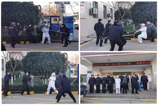 首先,演练模拟“情绪失控的患者”在医院内“袭击”医务人员的场景。演练开始,保卫科接到报警携带装备火速赶到事发现场,从各路口形成包围,首先利用装备隔离群众,同时对施暴分子进行劝导,控制现场。并立即拨打110报警电话,驻地派出所接到报警后最快时间赶赴医院事发现场,联合保卫人员成功将“情绪失控的患者”制服。然后,演练模拟“歹徒”在医院路边“拦路抢劫”行人的场景。听到呼叫后,保卫科巡逻人员火速赶到事发现场,利用装备控制歹徒,同时驻地派出所民警对歹徒进行劝导,控制现场。联合保卫人员成功将“歹徒”制服。