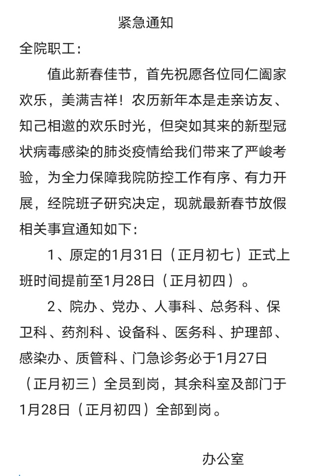 原定的1月31日(正月初七)正式上班时间提前至1月28日(正月初四),院办、党办、人事科、总务科、保卫科、药剂科、设备科、医务科、护理部、感染办、质管科、门急诊务必于1月27日(正月初三)全员到岗,其余科室及部门于1月28日(正月初四)全部到岗。