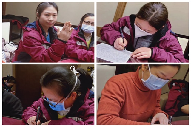 1月28日,抵达武汉第三天,陕西省援鄂医疗队宣布成立临时党支部,我院援鄂医疗队队长、老党员刘红艳主任迅速召开小组会议,向大家发起入党号召,话音刚落,国福云副主任、万月强副主任、王欣主治医师、马乐霞主管护师、 赵媛媛护师、尹霞护师、胡新颖护师迅速响应,纷纷申请入党。大家向入住酒店的前台借来纸和笔,就地书写入党申请书,志愿加入中国共产党,并由刘红艳主任和刘淑英老师为大家签字推荐!