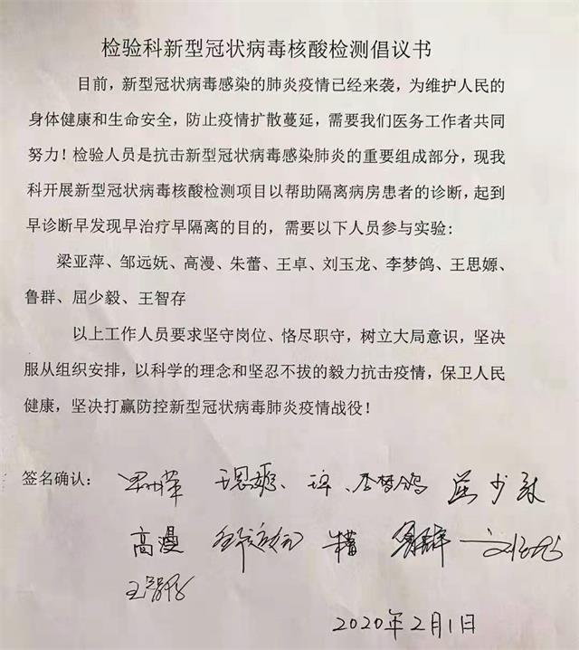 检验科成了除临床医护人员外距离病毒最近的人,是的,虽然我们没有接触患者,可病毒随时伴我们左右,但明知危险无处不在,在梁主任的号召下:王智存主动请缨作为一线检测人员,邹远妩、高漫、朱蕾、王卓、刘玉龙、屈少毅、李梦鸽、王思嫄、鲁群等9名工作人员纷纷报名请求参加,这种舍我其谁的表率引来全科人员的高度赞赏与支持,其他人员也纷纷表示会坚持学习理论与实际操作,随时做好接替准备。全科人员凝心聚力,面对这场没有硝烟的战场,坚决服从命令,坚守岗位,义不容辞。经培训后一线检测人员于1月31日晚上成功检测我院第一例核酸检测。