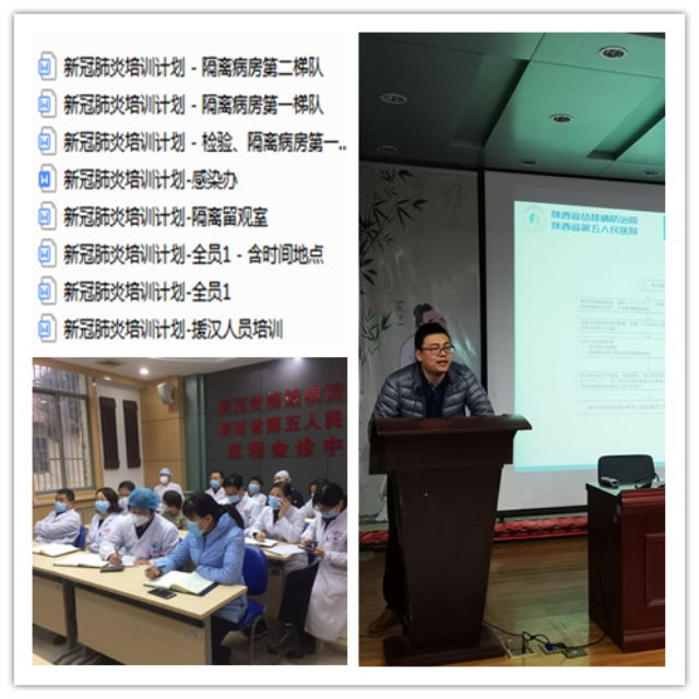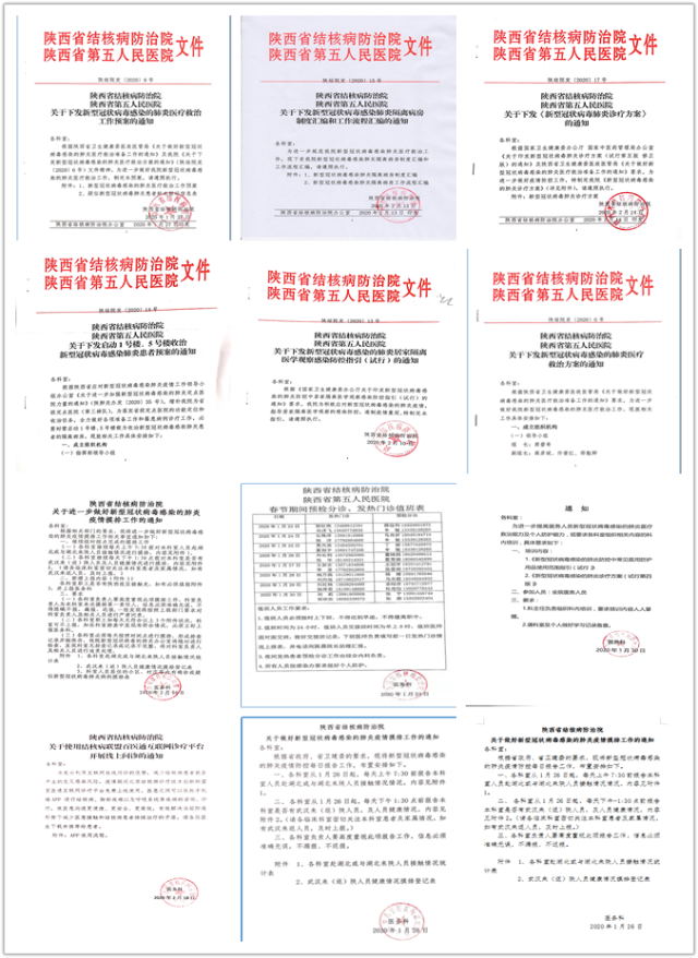 从1月22日拟定下发《新型冠状病毒感染的肺炎医疗救治方案》开始,在院领导小组领导下,在各部门的协调配合下,先后拟定下发《新型冠状病毒感染的肺炎医疗救治工作预案》、《新型冠状病毒感染的肺炎居家隔离医学观察感染防控指引》、《启动1号楼、5号楼收治新型冠状病毒感染肺炎患者预案》、《新型冠状病毒肺炎隔离病房制度汇编和工作流程汇编》及有关疫情摸排上报、诊疗方案学习等的各类通知十余份,规范诊疗,推进各项工作开展。