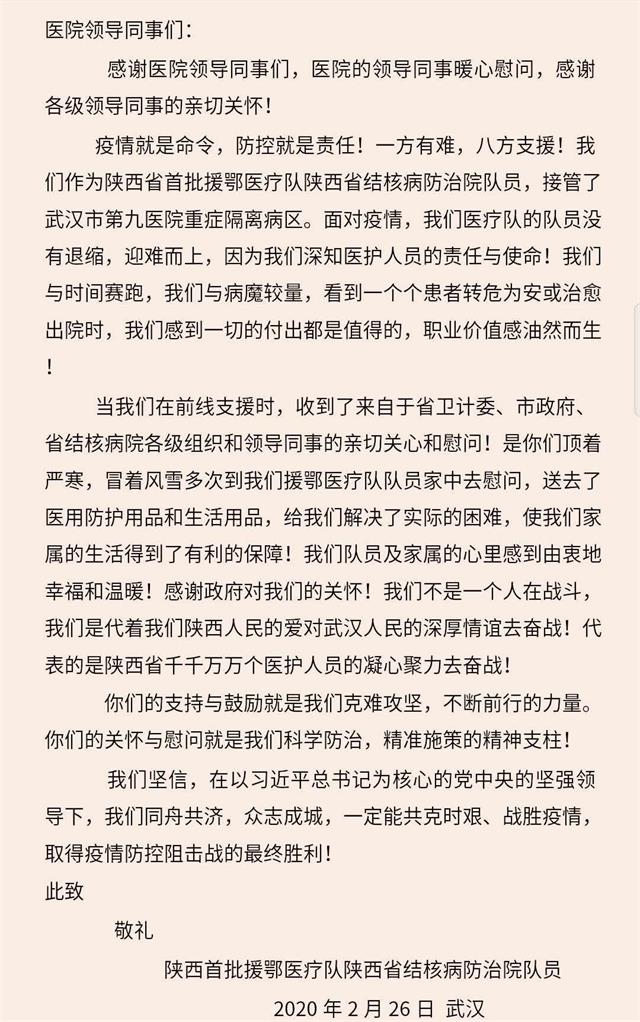 2月26日,我院首批援鄂医疗队队长刘红艳主任通过微信群为医院送上了一份的特殊礼物——感谢信,字里行间表达了全体援鄂人员对医院的感激之情。亲爱的逆行天使、省结防院的家人们,你们的心意医院已经收到!