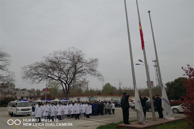 身着白衣,垂手肃立。上午10时整,升国旗降半旗仪式正式在我院行政楼门口举行,党委书记甘昭平带领职工干部集体庄严默哀3分钟,向在抗击疫情战争中牺牲的英雄和同胞们表达最崇高的敬意和最深切的缅怀。随后,医院三辆救护车和医院警用摩托车统一鸣笛,声音穿透长空,院内患者见之纷纷驻足,同步默哀。同时,为配合全国性哀悼活动,4月4日0时至24时,我院官网首页使用黑白页面。