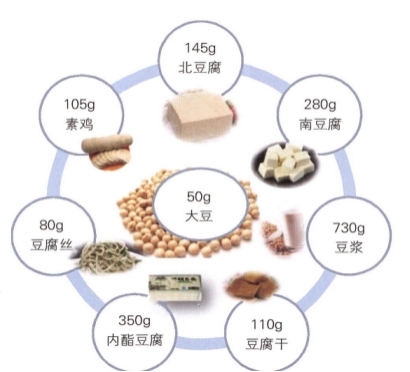 按照蛋白质含量进行换算,50g大豆相当于北豆腐约145g、南豆腐约280克、内酯豆腐约350克、豆浆约730克、豆腐干约110g、豆腐丝约80克、素鸡约105克。