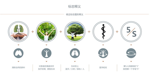 一、标志以肺叶为基础元素,表明肺结核防治院专科医院的属性。柔和动感的曲线延伸成数字“5”的造型与肺叶相连,形成一个循环运动的整体形态,象征人体肺部的呼吸运动,数字“5”也代表陕西第5人民医院的名称。柔和的曲线也像一个“S”,代表陕西,表明了陕西省结核防治院的地域属性。